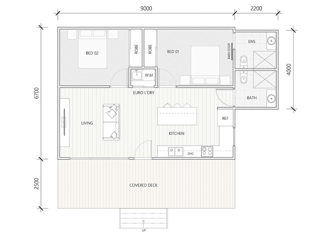 The Byron is a compact yet comfortable modular home designed for effortless modern living. The open-plan kitchen and living area creates a welcoming central space, flowing directly onto a covered deck that extends daily living outdoors. Two well-sized bedrooms are positioned for privacy, with the master featuring an ensuite for added comfort. A full main bathroom, European laundry, and smart storage solutions ensure practicality without sacrificing style. Ideal for couples, small families, or downsizers, The Byron offers a relaxed, functional layout that maximises space, light, and connection to the outdoors.
